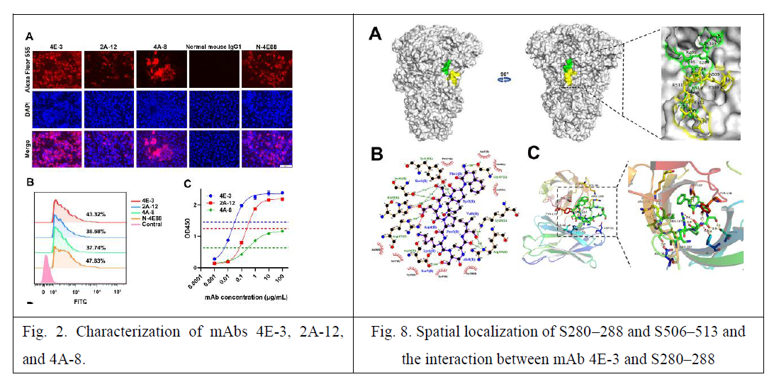团队前期鉴定了PDCoV的S蛋白优势中和抗原表位区(陈汭,Virus research,2019),本研究聚焦于优势中和抗原表位区S1-CTD蛋白,制备并筛选具有高效中和活性的单克隆抗体,再经蛋白截短表达和肽扫描技术,精准鉴定出高效中和抗原表位。初步的小鼠免疫试验证明可诱导小鼠产生PDCoV特异的中和抗体,随后进行了系统仔猪免疫试验评价,证明筛选的表位可诱导免疫仔猪产生PDCoV特异的中和抗体,并增强干扰素-γ应答,仔猪攻毒试验表明表位诱导的抗体具有一定的保护作用。本研究鉴定的中和抗原表位,在PDCoV免疫机制、新型疫苗研究和抗病毒药物靶点设计等方面具有重要价值。