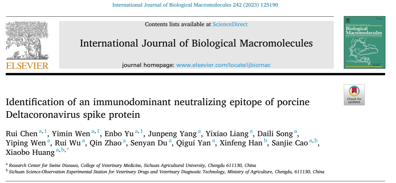 近日,德赢VWIN官方网站猪病研究中心黄小波教授团队在国际期刊《International Journal of Biological Macromolecules》(中科院1区Top期刊,2023的IF为8.025)发表题为“Identification of an immunodominant neutralizing epitope of porcine Deltacoronavirus spike protein”的研究论文。研究系统报道了猪δ冠状病毒(Porcine Deltacoronavirus,PDCoV)S蛋白一个免疫优势中和抗原表位的发现、鉴定及动物免疫原性评价等相关研究。