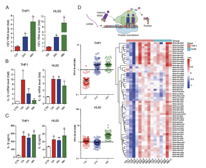 HEV是全球广泛流行的人兽共患病毒,感染后引起戊型肝炎,以急性肝炎为主。戊型肝炎对孕妇和免疫低下人群(如器官移植患者、HIV感染者)尤为危险。孕妇感染HEV可以导致严重的疾病并增加胎儿和新生儿的死亡风险。目前的研究主要聚焦于HEV病毒感染后宿主的免疫应答及抗病毒调控机制,本研究进一步解析了HEV感染对巨噬细胞内的tRNAome影响,进而操控免疫细胞中的炎症小体激活。tRNA在蛋白质合成中扮演着重要角色,它们通过携带氨基酸到核糖体为多肽链的合成提供底物。该论文发现了HEV重构了感染巨噬细胞中的成熟tRNAome。巨噬细胞中的tRNAome重塑为HEV调控NLRP3炎症小体的激活提供了一种新途径,而NLRP3炎症小体激活是先天免疫应答的关键一环。深入了解HEV感染、tRNAome重塑和NLRP3炎症小体激活之间复杂互作,将为开发针对性抗炎治疗策略开辟新思路。
