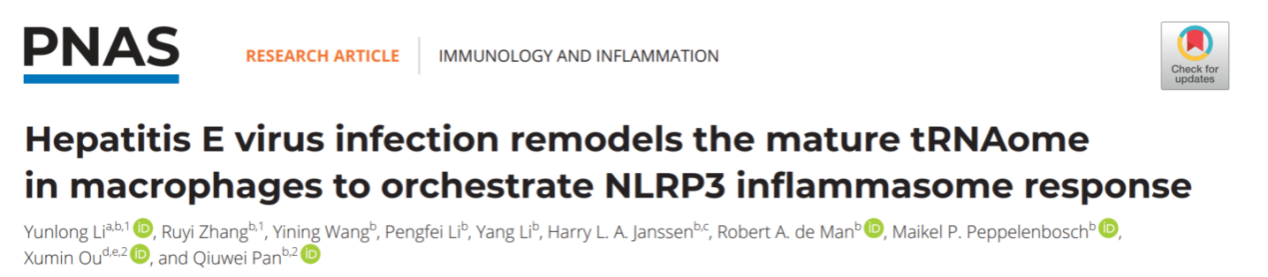 近日,德赢VWIN官方网站动物医学免疫学研究团队与荷兰伊拉斯姆斯大学医学中心等多家研究机构合作在PNAS(美国科学院院刊)上发表了题为“Hepatitis E virus infection remodels the mature tRNAome in macrophages to orchestrate NLRP3 inflammasome response”(戊型肝炎病毒感染重塑巨噬细胞中的成熟tRNAome以协调NLRP3炎症小体的激活)的研究论文。该研究揭示了戊型肝炎病毒(HEV)感染如何操纵巨噬细胞中的炎性小体激活机制。研究结果显示,HEV通过改变巨噬细胞中的成熟转运RNA组(tRNAome)来调控NLRP3炎症小体的激活。