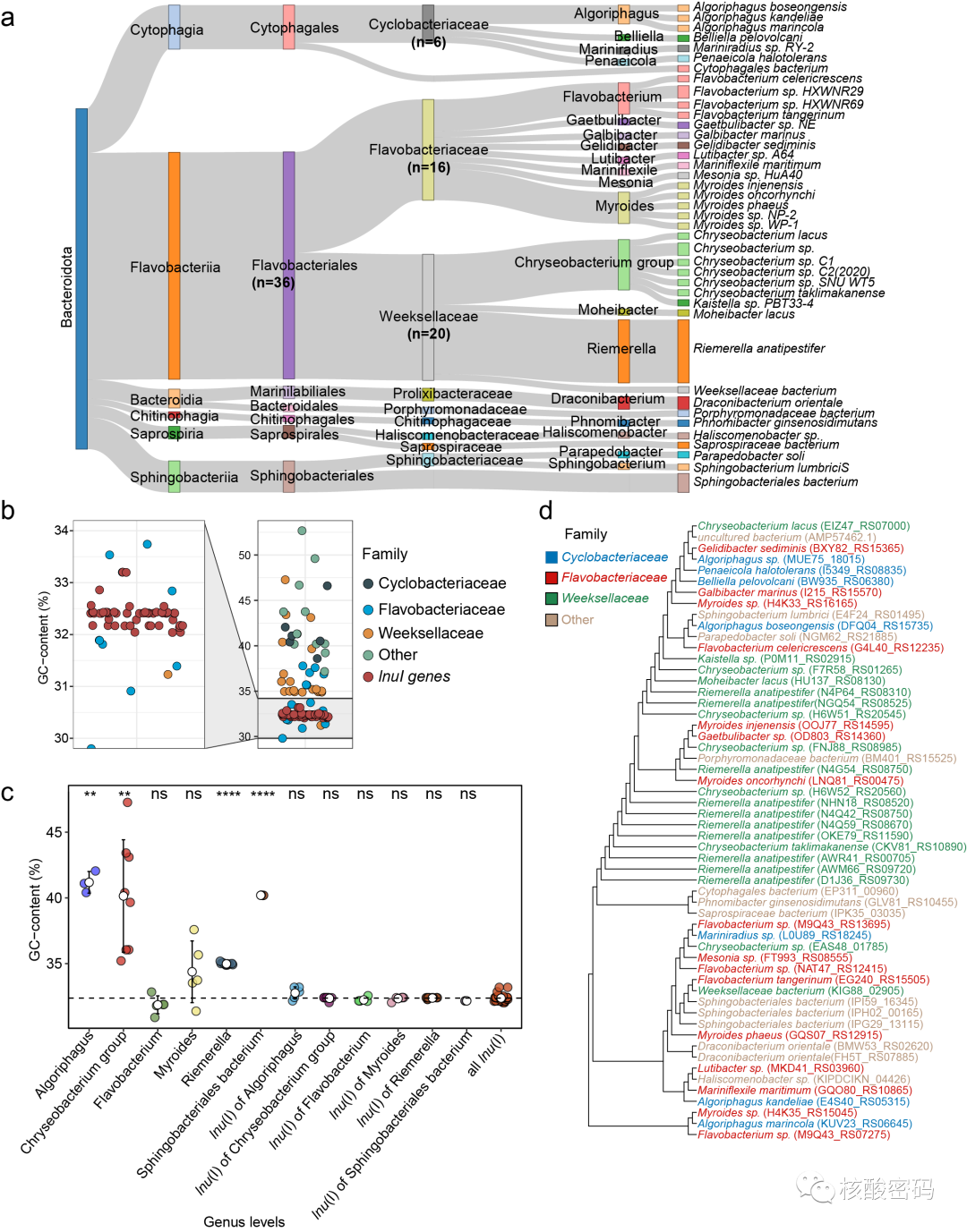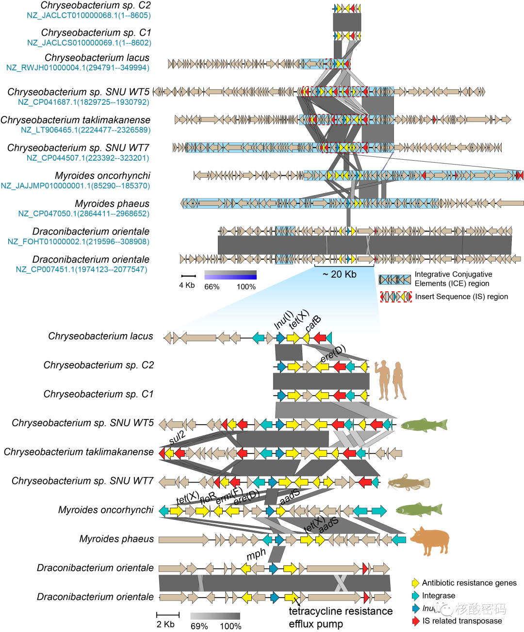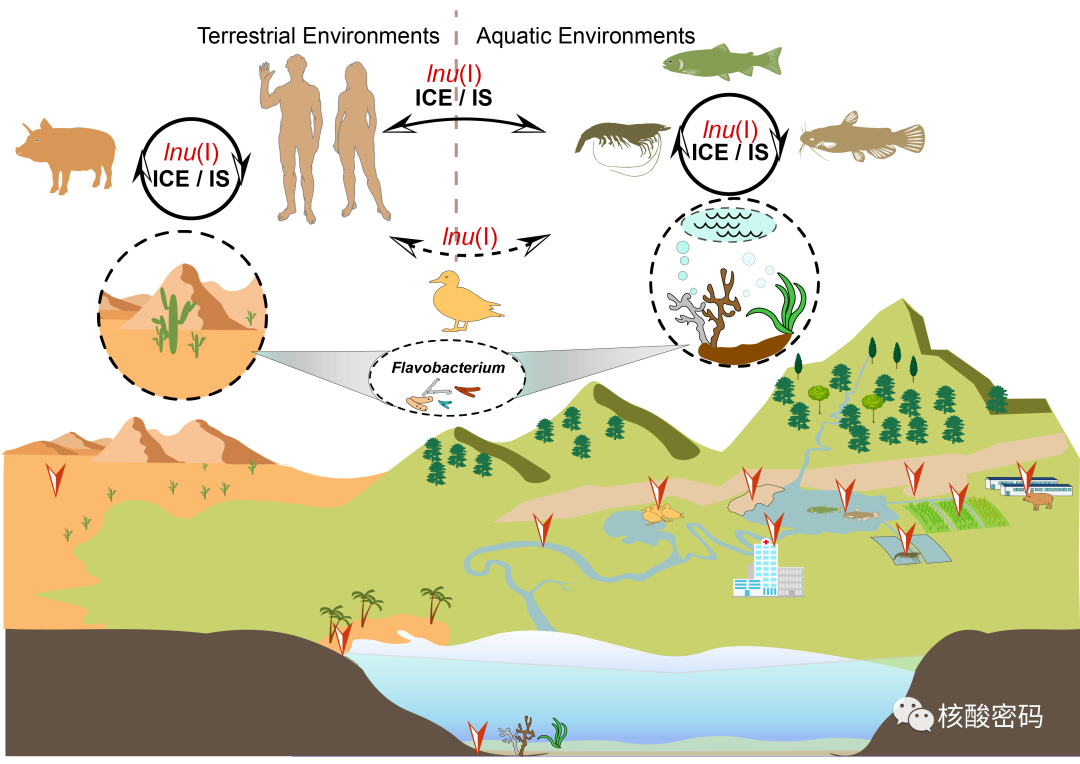 系统发育和分类学分析表明,黄杆菌科(Flavobacteriaceae)成员是lnu(I)基因的主要携带者(16/56,28.57%),环境(污泥及淡水)中的黄杆菌属(Flavobacterium)染色体与其lnu(I)基因具有相似的GC含量和稳定的遗传背景(图2)。值得注意的是,在人类和动物源致病菌已经检测到与插入序列(IS)和整合-结合元件(ICE)关联的lnu(I)基因(图3)。