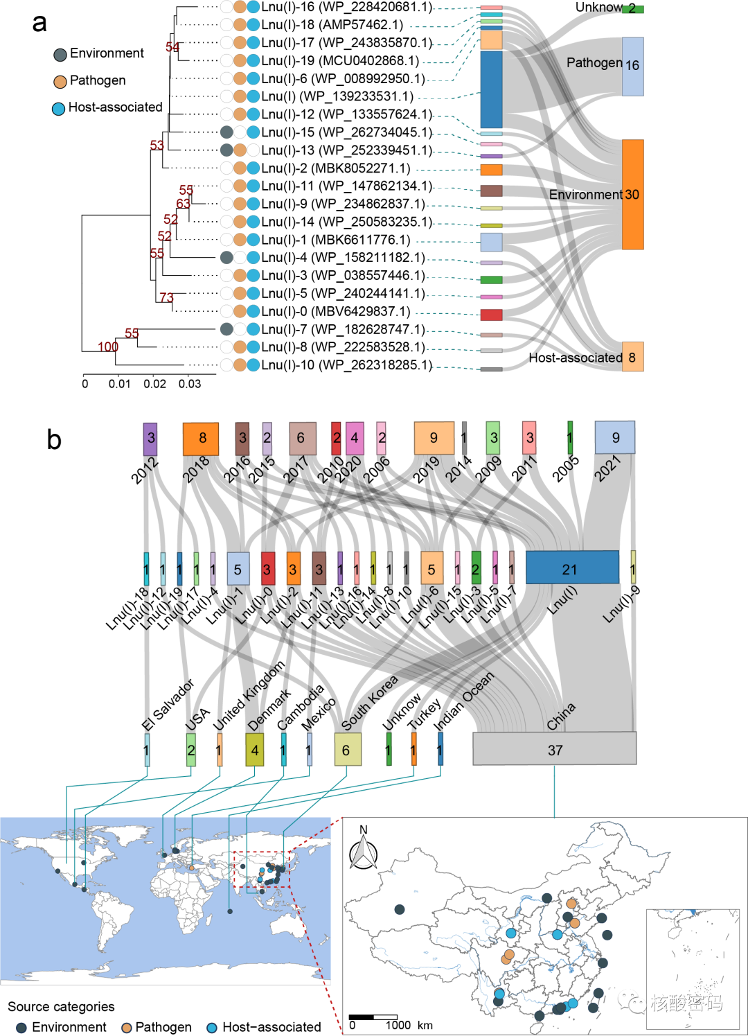 研究人员发现Lnu(I)与目前已知的lnu基因一致性低于66%,功能研究表明lnu(I)基因在鸭疫里默氏菌敏感菌株介导林可霉素(MIC =128 mg/L)和克林霉素(MIC =2 mg/L)抗性,其编码蛋白能在体外通过腺苷酰化作用将林可霉素和克林霉素灭活。流行病学调查表明,在我国四川、安徽,山东等8个省份的鸭疫里默氏菌分离株已检测到了lnu(I)基因阳性菌株,最早可追溯到2011年。进一步通过基因组流行病学分析,从多达36个细菌种的染色体或质粒上鉴定出了56个lnu(I)序列,并且这些细菌主要源于环境(图1)。