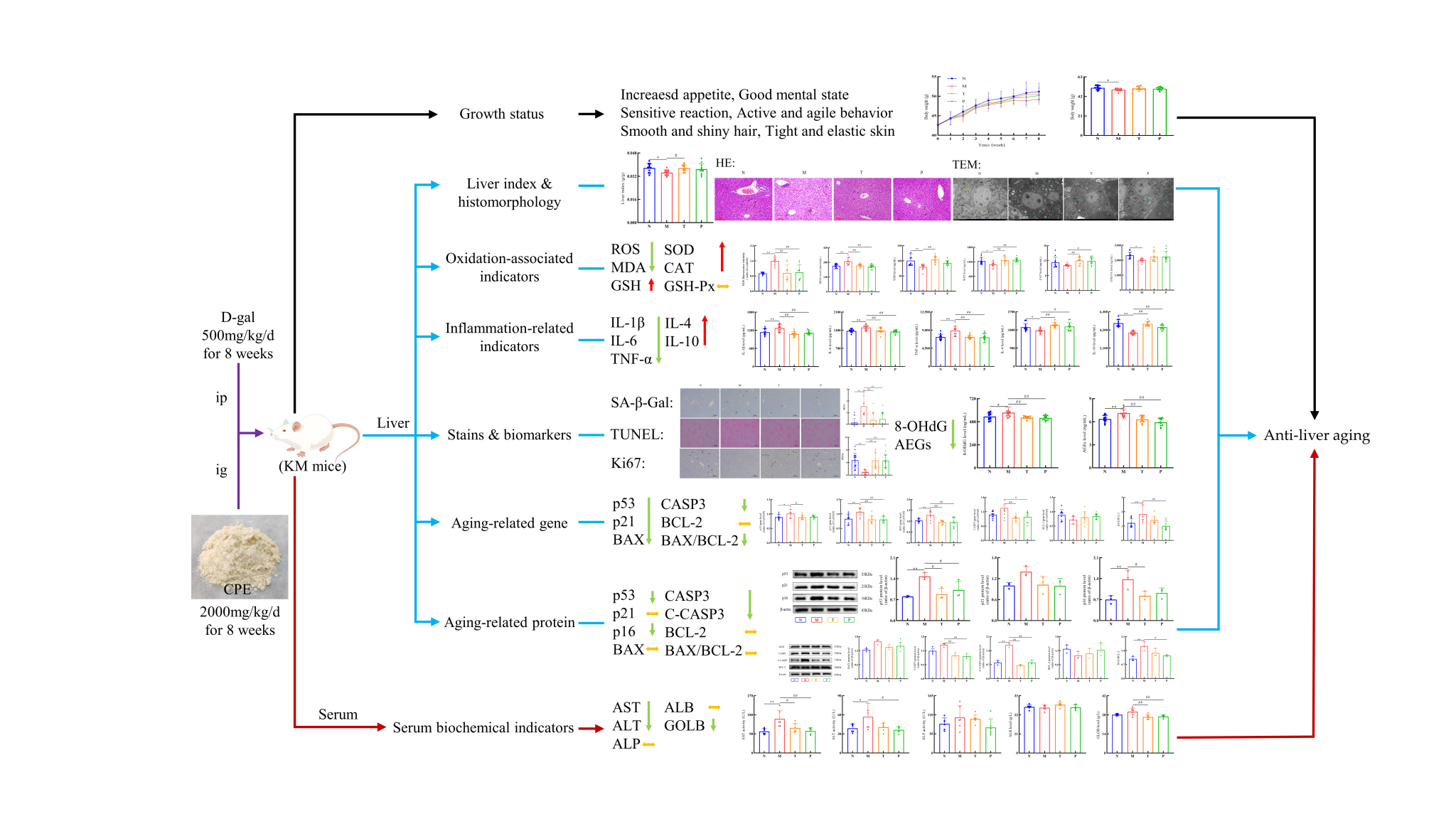 近日,德赢VWIN官方网站临床兽医学系沈留红副教授课题组研究成果“Cow placenta extract ameliorates d-galactose-induced liver damage by regulating BAX/CASP3 and p53/p21/p16 pathways”(奶牛胎盘提取物通过调节BAX/CASP3和p53/p21/p16通路改善d-半乳糖诱导的肝损伤)在国际著名期刊《Journal of Ethnopharmacology》(民族药理学杂志)(二区TOP, IF=5.4)在线发表(原文链接:https://www.sciencedirect.com/science/article/pii/S0378874123015556),探讨了CPE对d-半乳糖(d-gal)诱导的衰老小鼠肝脏的保护作用及其机制。这项研究首次全面研究了奶牛胎盘提取物在保肝领域的作用机制,研究结果一方面促进了奶牛胎盘的回收利用,另一方面为天然保肝和抗衰老药的研发提供了思路。
