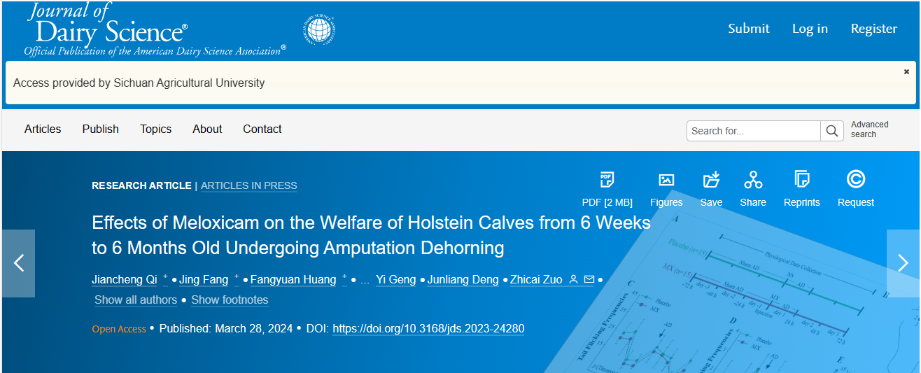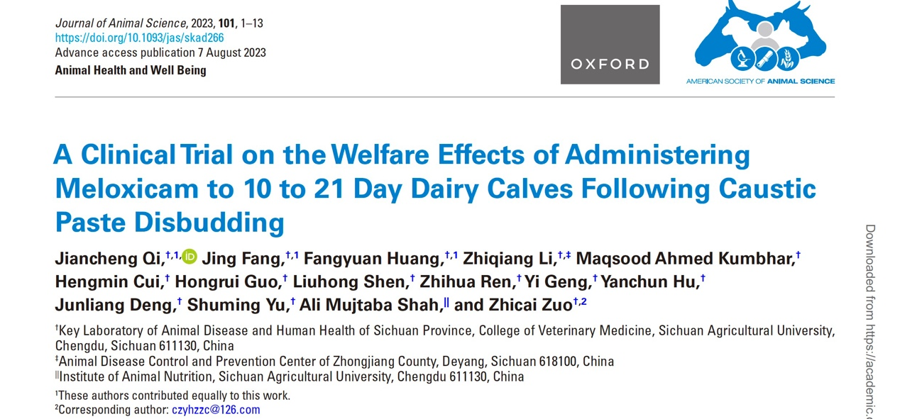 据悉,该团队还研究了美洛昔康对10~21日龄犊牛化学去角福利效果的影响,研究成果“A Clinical Trial on the Welfare Effects of ministering Meloxicam to 10-21 Day Dairy Calves Following Caustic Paste Disbudding”发表在《Journal of Animal Science》(JCR2,IF=3.3,https://academic.oup.com/jas/article/doi/10.1093/jas/skad266/7238421)。