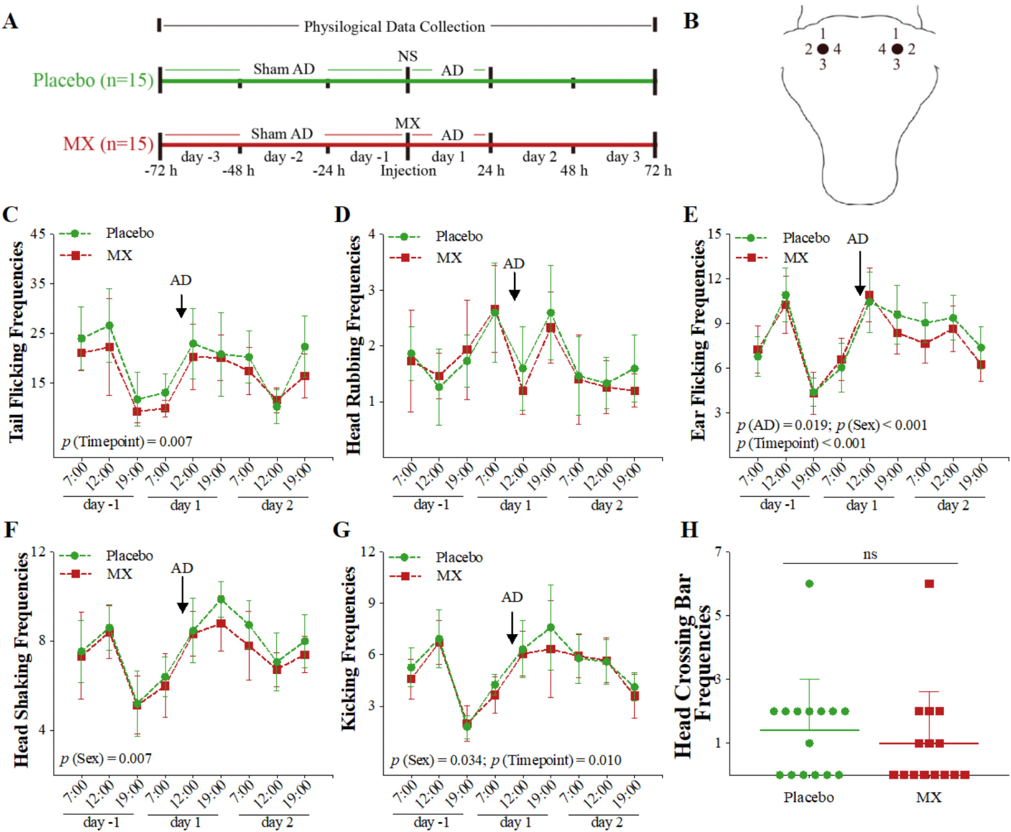 研究将30头荷斯坦犊牛随机分为2组,第一组(安慰剂)在角根部皮下注射5 mL利多卡因,在颈部皮下注射0.9%生理盐水,剂量为0.025 mL/kg,在去角手术前10分钟给药;第二组接受利多卡因和美洛昔康的联合用药:在角根部皮下注射5 mL利多卡因,在颈部皮下注射20 mg/mL美洛昔康,剂量为0.025 mL/kg,也在去角手术前10分钟给药。观察并监测30头荷斯坦犊牛对疼痛的相关行为(甩尾、摇头、甩耳、揉头、交叉头和踢腿)以及生理参数(心率、直肠温度、呼吸频率、机械伤害阈值(MNT)、日常活动步数和食物摄入量)的影响。结果显示,去角手术增加了犊牛弹耳的频率,并导致呼吸频率、心率、直肠温度和日常活动步数的升高;同时总食物摄入量、饲料摄入量、干草摄入量、MNT下降,前列腺素E2(PgE2)、白细胞介素-1β(IL-1β)、肿瘤坏死因子-α(TNF-α)、一氧化氮(NO)和丙二醛以及谷胱甘肽过氧化物酶的浓度增加。结果表明,利多卡因和美洛昔康联合给药有助于降低去角手术对犊牛的不良影响,进而支持在6周至6个月大的犊牛去角手术中使用美洛昔康联用局部麻醉剂。