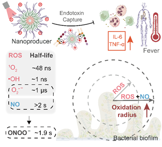 光动力疗法作为一种新兴的治疗手段,通过产生活性氧(ROS)来诱导氧化损伤,展现出同时瓦解生物被膜和清除细菌的潜力。然而,ROS的半衰期较短,这大大限制其氧化损伤的有效范围,影响了光动力疗法的整体疗效。在实际临床情况中,混合细菌感染更为普遍。光动力疗法诱导的氧化损伤可能会触发细菌内毒素的释放,进而引发炎症、发热等一系列健康问题。因此,在将光动力疗法应用于细菌生物被膜的治疗时,如何扩大ROS的氧化作用范围,并有效降低由内毒素释放所引发的健康风险,成为了一个亟待解决的重要科学挑战。