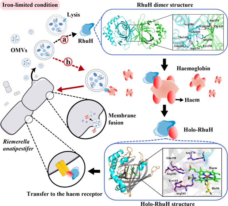 近日,由国家农业(水禽)产业技术体系岗位科学家、德赢VWIN官方网站程安春/刘马峰教授团队和福建师范大学欧阳松应教授团队合作在中科院一区Top期刊Advanced Science上发表题为“Structural Basis and Mechanism of a Unique Haemophore in the Haem-iron Acquisition by Riemerella anatipestifer(一种新型血红素载体蛋白参与鸭疫里默氏杆菌血红素摄取的结构基础及作用机制)”的研究论文。该研究以鸭疫里默氏杆菌为代表,在黄杆菌目中鉴定了一种新型的血红素载体蛋白RhuH,并解析了其独特的结构特征和作用机制,为深入理解黄杆菌目细菌对血红素的摄取机制提供了新的见解。