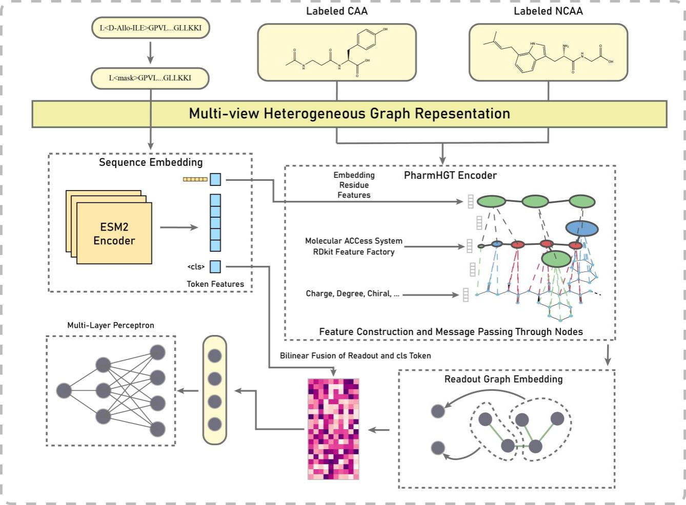 本研究创新性地将非经典氨基酸的化学结构信息与预训练语言模型提取的蛋白质序列特征相结合,构建多层次异质图,通过AmpHGT模型更准确地捕捉这些氨基酸的化学特性,实现对抗菌活性的有效预测。