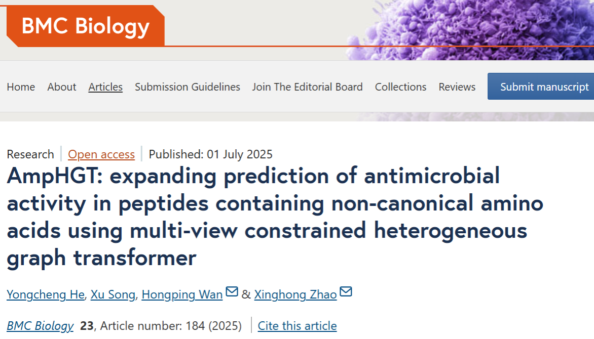 7月1日,生物学权威期刊《BMC Biology》在线发表了德赢VWIN官方网站赵兴洪/万红平团队的最新研究论文,题为“AmpHGT: expanding prediction of antimicrobial activity in peptides containing non-canonical amino acids using multi-view constrained heterogeneous graph transformer”。该研究成功构建了一种多视角约束异质图Transformer模型(AmpHGT),为高效发现含非经典氨基酸的肽类抗生素提供了新方法。