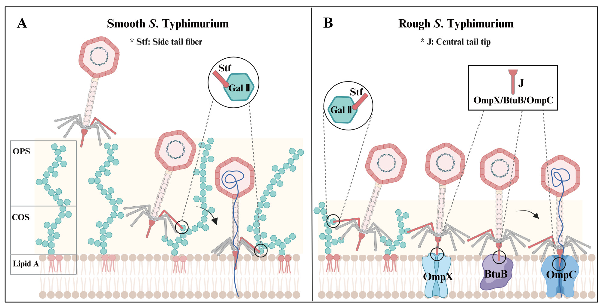 抗生素耐药性(AMR)是全球公共卫生的重大威胁,多重耐药沙门菌感染尤其令人担忧。噬菌体疗法作为对抗耐药菌感染的新型策略,其核心在于精准理解噬菌体识别和感染宿主细菌的分子机制。沙门菌表面覆盖的脂多糖(LPS)O-多糖(OPS)层对许多噬菌体构成物理屏障,且沙门菌在自然环境中可通过相变在光滑型(OPS完整)和粗糙型(OPS缺失)LPS表型间切换以适应环境变化。然而,噬菌体如何适应宿主菌OPS变化以成功建立感染,其机制尚不清晰。