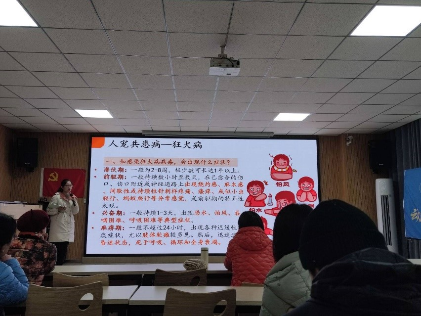 朱轶凌同志以“人兽共患病”为主题,围绕人兽共患病、人兽共患病的危害、“传播途径及感染症状”以及“如何预防人兽共患病”四个方面向在座的观众进行讲解。她以谢跃教授所发表的儿童眼球感染钩形虫相关文章为例,形象地讲述了体内寄生虫对人体和宠物造成的危害,提醒观众保持良好的饮食和卫生习惯,对宠物进行定时驱虫、疫苗接种等。接着,她以非典、禽流感、上海肝炎三个典型的具有流行性的人兽共患病为例,再次强调人兽共患病的危害性。最后朱轶凌同志讲述了人畜共患病在生活中的可能传播途径及防范方法。