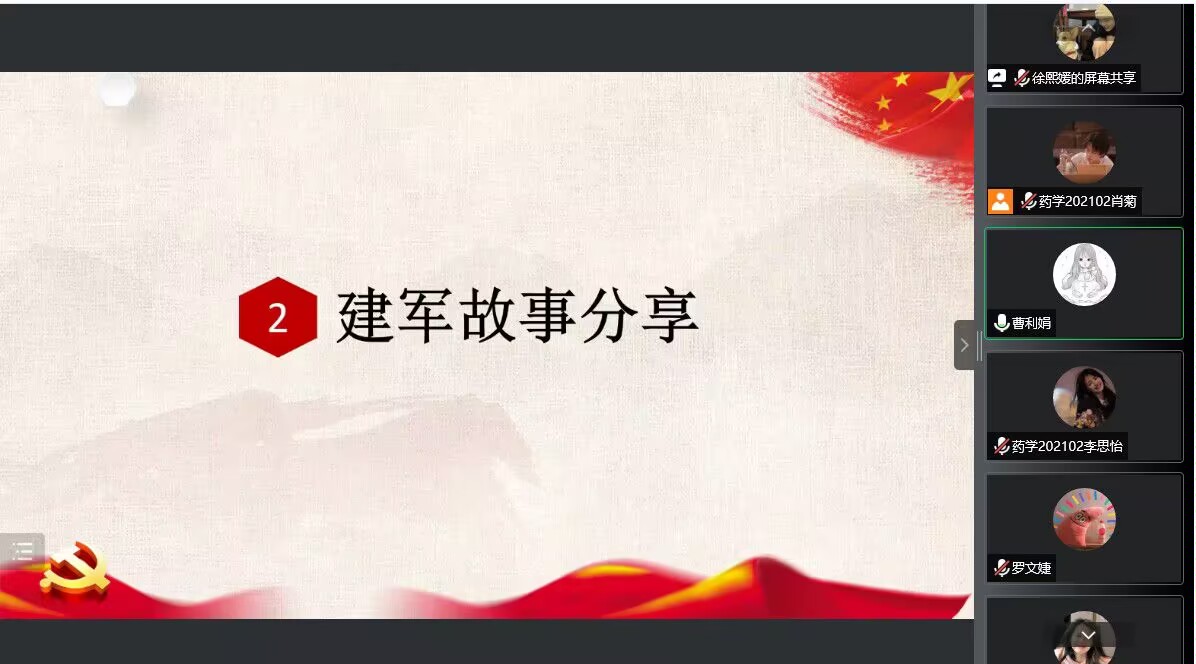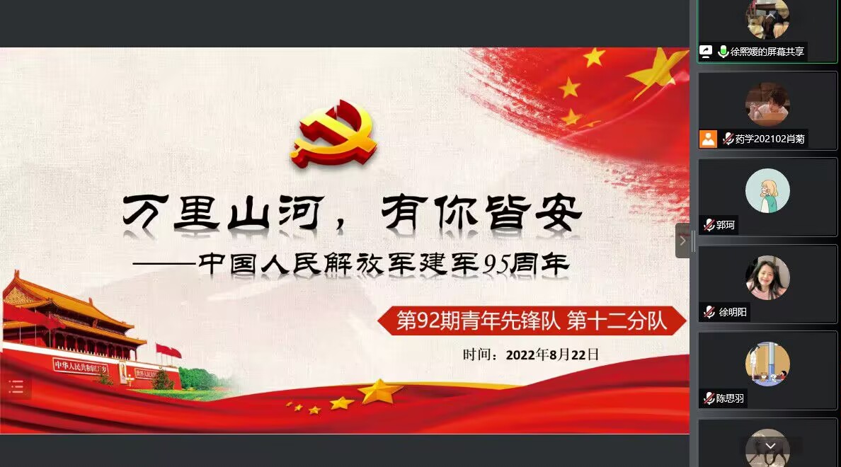 8月22日18:30第92期青年先锋队第十二分队在线上开展了八月的时政学习,本次时政学习的主题为“万里山河,有你皆安——中国人民解放军建军95周年”,学习共分为四部分,分别为建军节史学习教育,建军故事、影片分享,建军知识竞答,学习感想及祝福的收集。