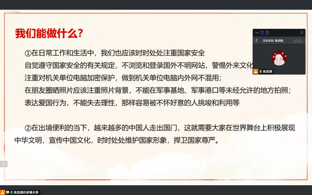 最后,分队队员就主题进行讨论,延伸到大学生如何对网络陷阱进行防范?作为普通人如何维护国家安全?大家还分享了周围的案例,让我们对国家安全有着更深入的见解。队员们纷纷就种种问题发表见解感悟,各抒己见,展现了大家的学习热情以及良好的学习效果。队员们的发言无一不显露出对学习内容的深入领悟与思考。“安而不忘危,存而不忘亡,治而不忘乱。”当前我国国家安全内涵和外延比历史上任何时候都要丰富,我们要以实际行动护卫国家安全,依照党员标准严格要求自己,做好先锋带头作用,致力提高国家安全能力。