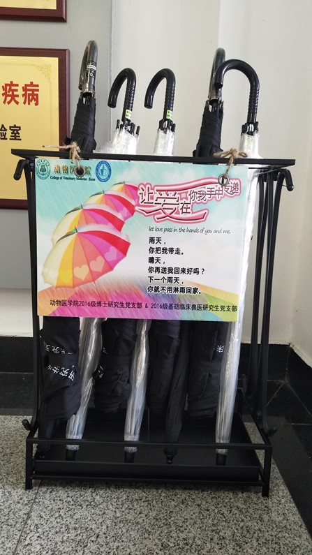 8月2日起,动医学院2016级博士党支部和2016级基础临床兽医研究生党支部携手,为在六教学习和工作的师生们提供了30把雨伞(20把常备,10把备用),分设两个伞架,置放于教学楼两个大门出口处,供有需要的师生取用,用完自行归还。放置1个多星期来,为不少师生解决了“燃眉之急”。研究生党员的实践行动得到了大家的赞可。