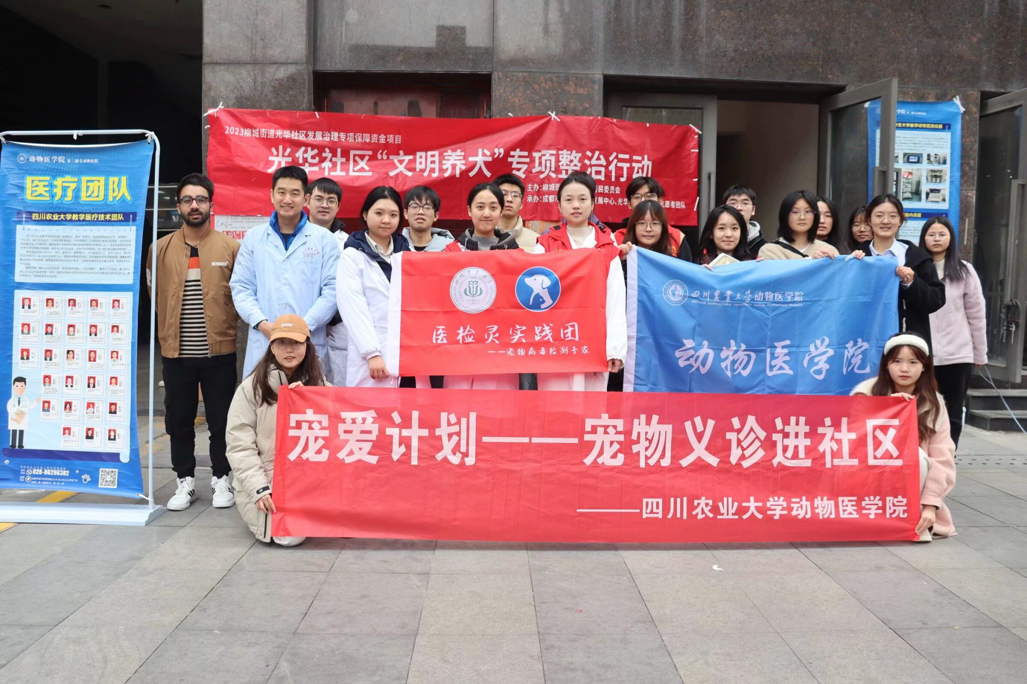 线上实践期间,团队成员与第二分队联合宣传,转发团队官方账号“宠爱计划”在小红书、抖音、快手等各大网络平台上发布的有关科学养宠的科普视频和文章,并撰写新闻报道。通过持续的宣传活动,提高了社会民众对正确养宠的认知,同时团队成员们也在过程中积累了更多的专业知识,拓展了专业深度,为日后的学习打下了基础。除线上实践,团队还积极联系学校周边社区,于2月19日在成都市温江区光华社区,联合德赢VWIN官方网站实志中心举行了线下宠物义诊活动。活动邀请了德赢VWIN官方网站教学动物医院的周紫峣医生以及研究生师兄师姐组成的专业义诊团队,为宠物提供常规体检和专业诊疗建议。团队成员为社区民众发放科普宣传手册,讲解科学养宠知识,并于现场观摩学习宠物诊疗理论和宠物体检基础手法,可谓收获满满。