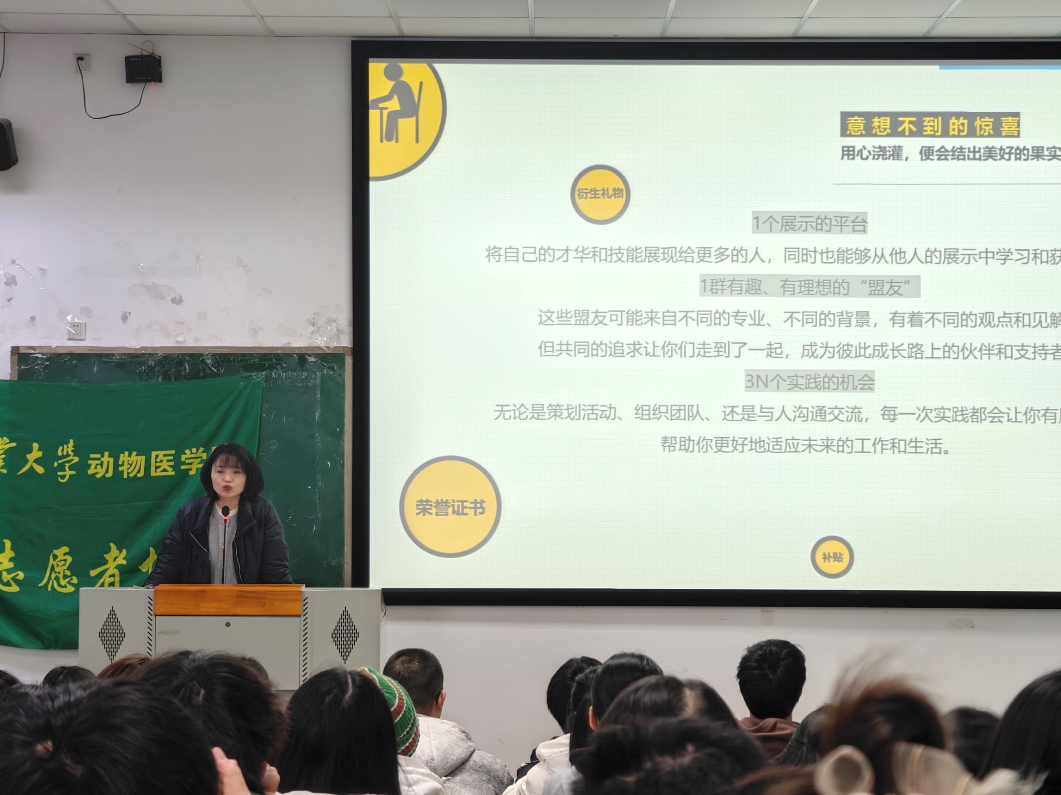 此次宣讲会的成功举办,标志着成都市高校文明实践志愿服务联合引领行动项目有了良好的开端。动医实志中心将在3月11日、12日于食堂小广场处设点宣传,进一步加深川农学子对该项目的了解,鼓励学子们积极参加社会实践,在社会实践中增长才干、锻炼毅力、培养品格、明确自身定位,深入理解新时代文明实践理论,将个人小我投入到社会大我之中,让青春在社会实践中绽放光芒。