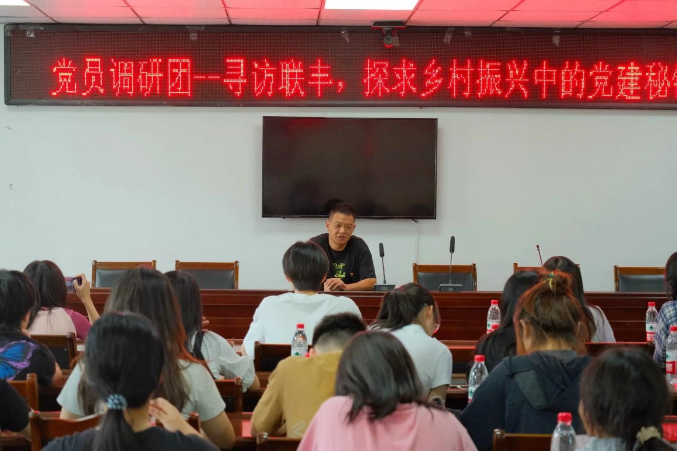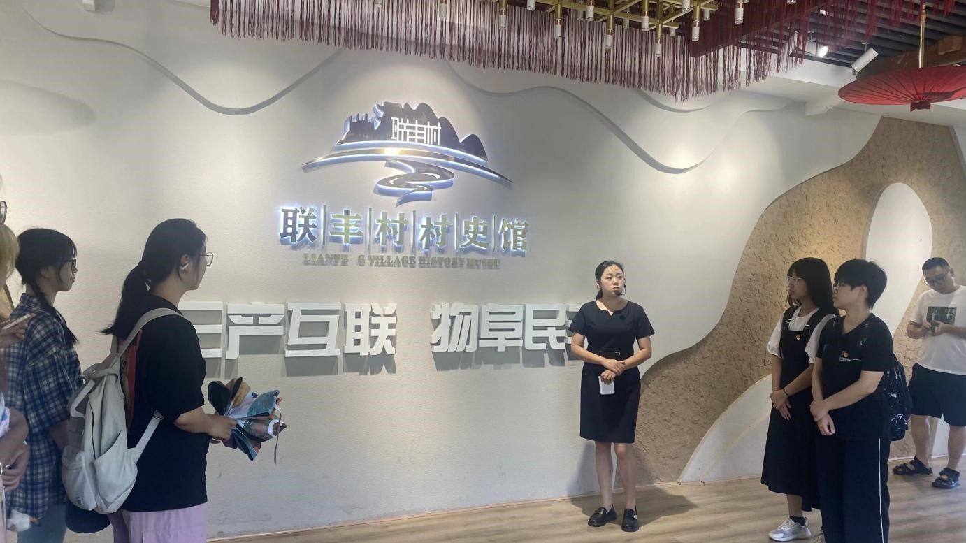 首先,调研团来到联丰村村史馆,在讲解员的介绍下了解了联丰村的历史沿革和乡村振兴成就。在游览完村史馆后,调研团有幸对联丰村王主任进行了采访。当谈到联丰村达成乡村振兴成就的秘诀时,王主任认为这些成就离不开联丰村探索出来的符合自身实际的“一领双融”发展模式。王主任解释道:“‘一领’即以党建为引领,让党组织成为产业发展的指引者,乡村治理的领航者,乡村振兴的掌舵者;‘双融’即村委会与景区管委会服务管理融合,农文旅产业发展融合。”