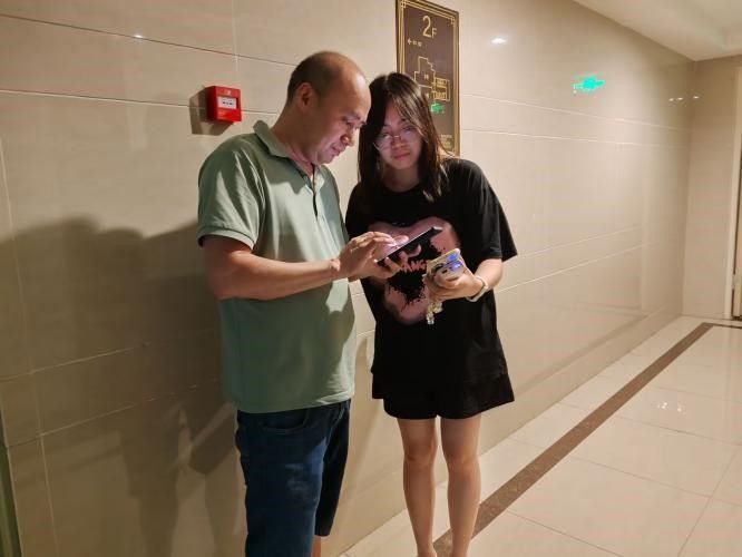 (图为社区调研分队成员正在请社区居民进行线上问卷的填写)