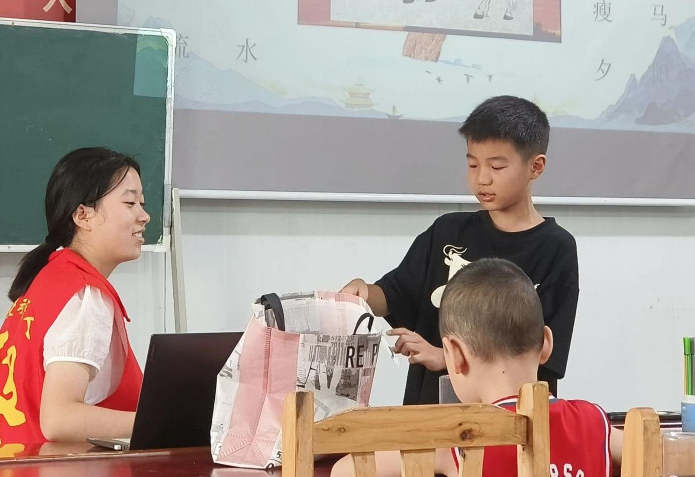 在夏令营活动初期,虽然团队成员带着满腔热情,早已准备好了教案以及所需材料,但困难总是不可避免的:教室长期未使用而杂乱不堪、同班内孩子们年龄性格差异过大、团队成员初来乍到需要与此处磨合。这些困难随着团队的每日例会总结以及不断学习修正而被克服。团队在该班级推行积分制度,奖惩并行,同时因材施教,对部分孩子使用其他方法管理,与孩子们磨合出了更好的交流与讲课方式,使整个夏令营活动有序步入正轨。