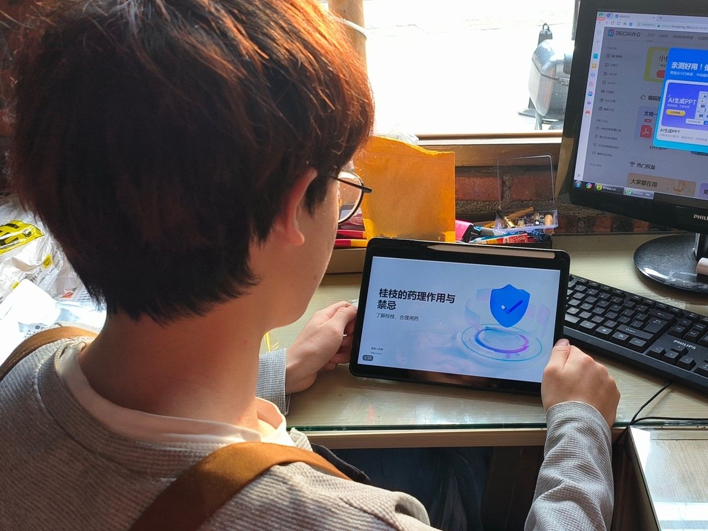 (分队成员赵子菡在搜查甘草资料)