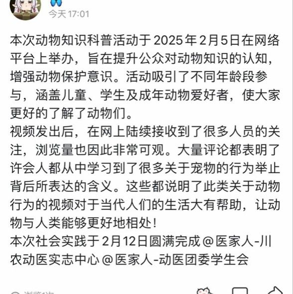 此次以争做专业领域探索者为主题的网络科普动物知识实践,为动物医学的学子们提供了一个展示自我、服务社会的平台。通过第一次实践的圆满完成,成员们积攒了丰富的经验,相信在未来,他们将以更饱满的热情、更专业的知识、更创新的方案,为推动动物保护事业的发展贡献自己的力量,用行动去传递关爱动物的善意情怀。
