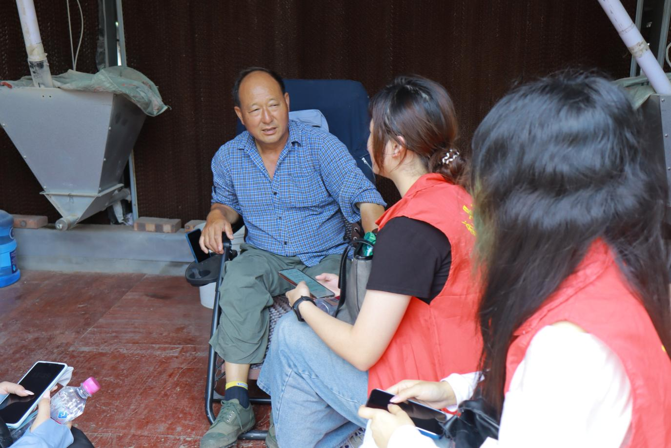 团队抵达养鸡场后,场主向团队介绍了养殖情况。经了解,该养鸡场主要养殖黄六肉鸡,并且养殖规模随季节变化调整:夏季因天气炎热,肉鸡易患病,数量控制在一万只左右;冬季则增至一万一千只。养鸡场中96%为公鸡,因其生长速度更快更符合市场需求。养殖场中,肉鸡的出栏时间分为68天、73天和83天三种,客户可根据需求灵活选择。