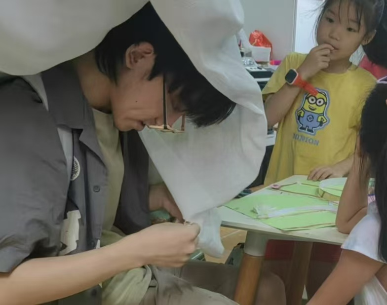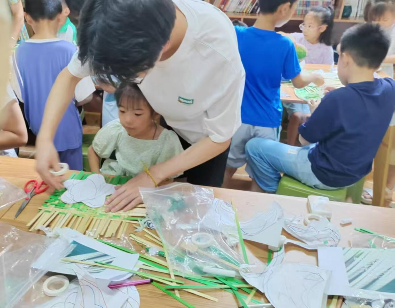 在最后一堂课—“非遗竹编”课堂上,小队成员们和孩子们一起,在竹编老师的教导下,一起编制传统竹扇。虽然过程很艰难,不少小朋友无从下手,甚至一度打算放弃,但是在老师以及队员们的鼓励帮助下,所有小朋友都制作完成了自己的那一把竹扇。古老工艺与现代童趣在课堂上碰撞,迸发出的不仅是传统工艺的魅力,还有其背后熠熠生辉的工匠精神。