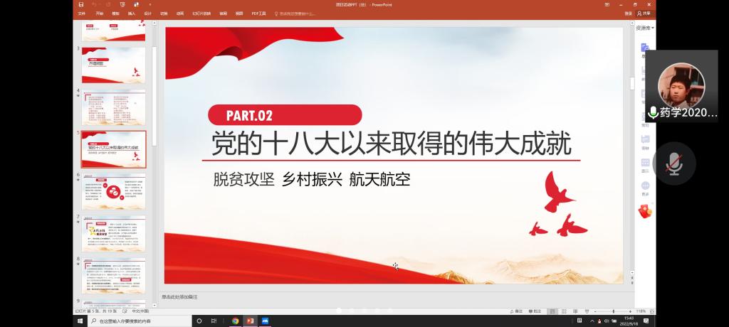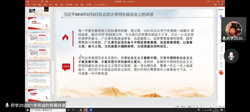 由于线下疫情形势严峻,支部严格遵守学校和属地疫情防控要求,本次团日活动全程采取线上腾讯会议的方式举行。本次线上主题团日活动分为两个主题板块,分别进行了“新时代的伟大成就”主题微团课以及《论党的青年工作》专题学习。
