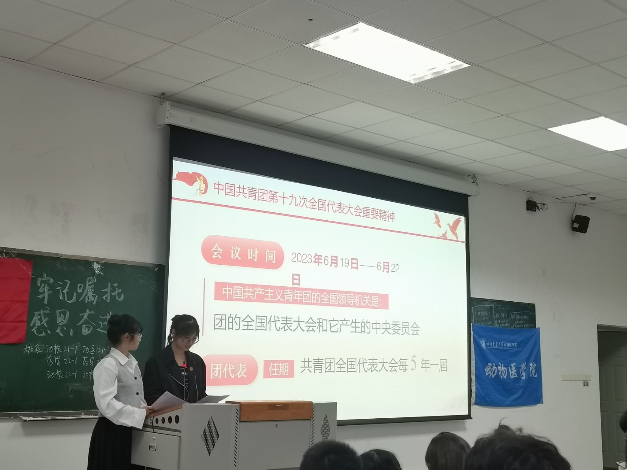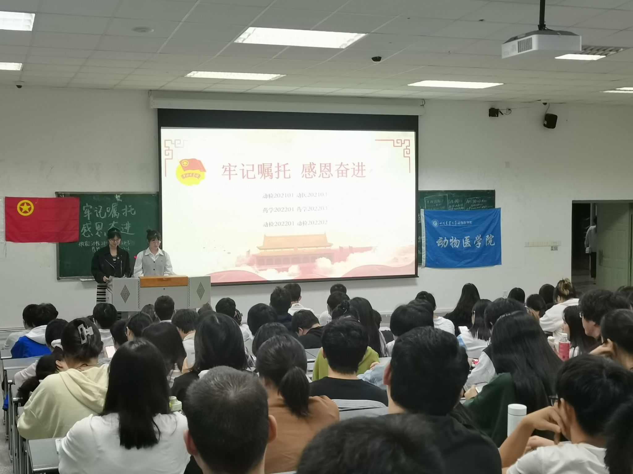 9月24日晚上,为深入贯彻习近平总书记来川视察重要指示精神,认真学习贯彻习近平总书记在同团中央新一届领导班子集体谈话时的重要讲话精神,动检202201、动检202101、动检202202、动检202103、药学202201、药学202203联合在4A-105教室开展了主题为“牢记嘱托,感恩奋进”的九月班团活动,总计参会170人。