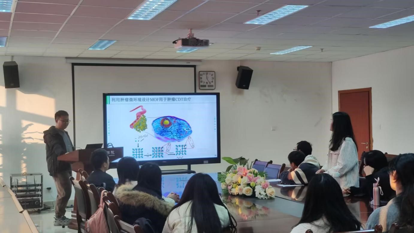 活动围绕药品研发及医疗应用等主题展开。在讲座环节中,优秀学子段少龙分享了关于如何利用肿瘤微环境设计MOF用于肿瘤细胞定向破坏治疗(CDT)。在分享会环节,段少龙为参与者分享了他们研究室的研究经验和见解,让药学学子有机会了解到本专业药学实验室研究的内容。