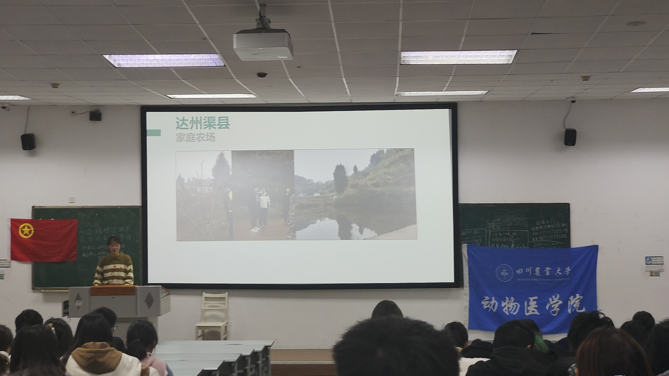 在“青春返家乡,筑梦建新功”实践育人成效主题分享环节,动医202104陈佳雨分享了所属团队前往绵阳三台县、达州渠县、遂宁大英果园等多地进行实地助农的社会实践经历。其中,陈佳雨重点分享了在达州渠县遇到投身农业工作一线的川农学子的故事,在川农学成后,他们回到家乡,用自身所学,反哺家乡。陈佳雨借此激励在座学生向前辈学习,投身于强国建设的实践中,为三农发展贡献自己的青春力量。