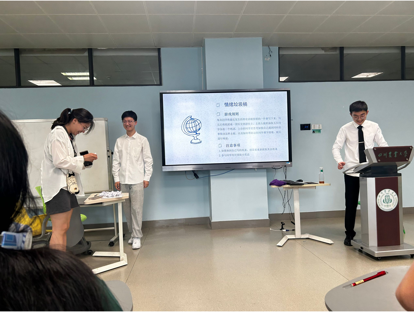 为了确保活动的顺利进行,主持人祁淼航和董丹瑜将小班成员以寝室为单位进行分组并为活动中的小游戏出谋划策。在活动进行过程中,两位主持人积极调动活动氛围,小班成员们也热情参与。在分享环节,多名学子分享了自己有关各类情绪的经历以及解决措施。该环节为小班学子解决未来学习和生活中的情绪问题提供了参考模板。活动中,小班学子积极并认真参与。尤其在心理小游戏环节中,主持人通过情绪传递,emoji猜心情和情绪垃圾桶三个有关心理的游戏,调动全班学子参与活动的积极性,不仅放松了小班成员们的心情,也解决了一些学子近段时间来的烦恼。经过心理团辅活动的举办,小班成员们近段时间的烦恼得到了很好地释放,也学会了更好处理情绪的方法。