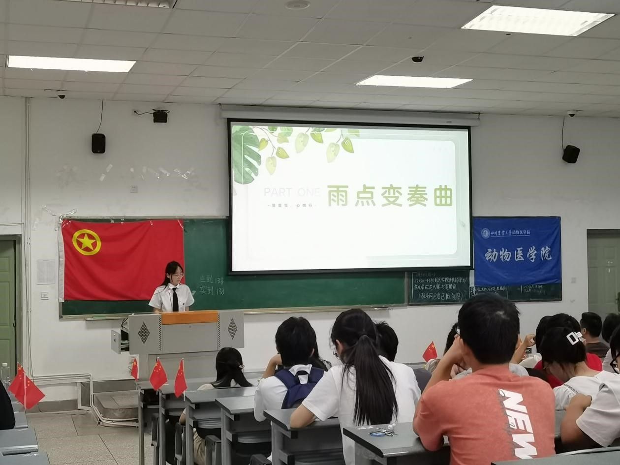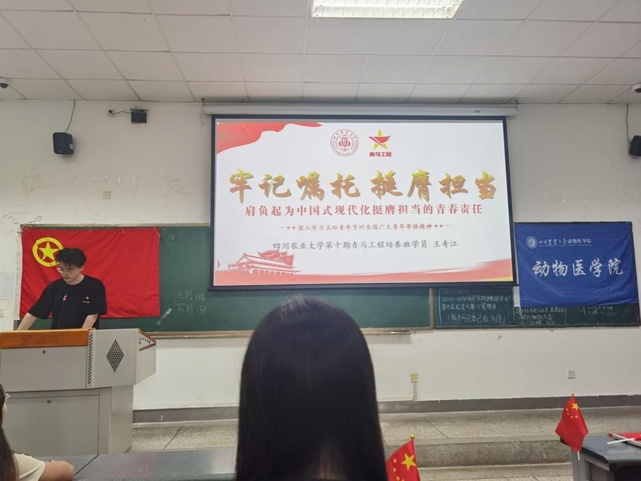 本次班团活动在全体人员齐唱团歌的歌声中拉开帷幕。第一部分是“学深悟透五四寄语,奋力书写青春篇章”主题学习。在主持人付灵爽洁和牟晨的带领下,各支部成员深入学习贯彻习近平总书记五四重要寄语精神,领悟其丰富内涵和实践意义。同时本次活动邀请到校第十期青马班学员王奇江和被评为五四红旗团支部的草学202102班的团支书进行主题宣讲。之后全体成员共同观看了校团委原创五四主题视频《青春的誓言》,该环节激发了青年的青春活力,引导全体成员继承和发扬五四精神,肩负起为中国式现代化挺膺担当的青春责任。