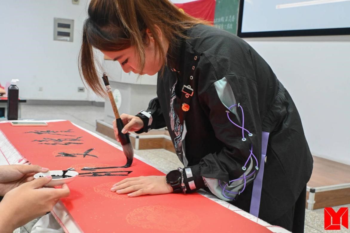 “琴音悦耳畔,笔墨绘书卷”。伴随着现场弹奏的古筝琴音,书画协会会员马铭杭写下书法作品并当众展示,让现场学子们切身感受到了中华传统文化的魅力,增强文化自信。