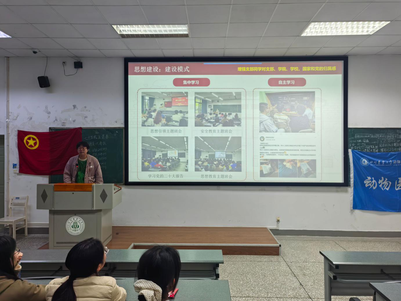 为深刻领会中华人民共和国成立75周年以来的辉煌成就,进一步激发广大青年学生的爱国热情,并加强学风与班风建设,11月12日,动医202303班、动医202405班、药学202303班、药学202401班、药剂202301班共5个团支部在德赢VWIN官方网站成都校区4A-208教室联合开展了主题班团活动。