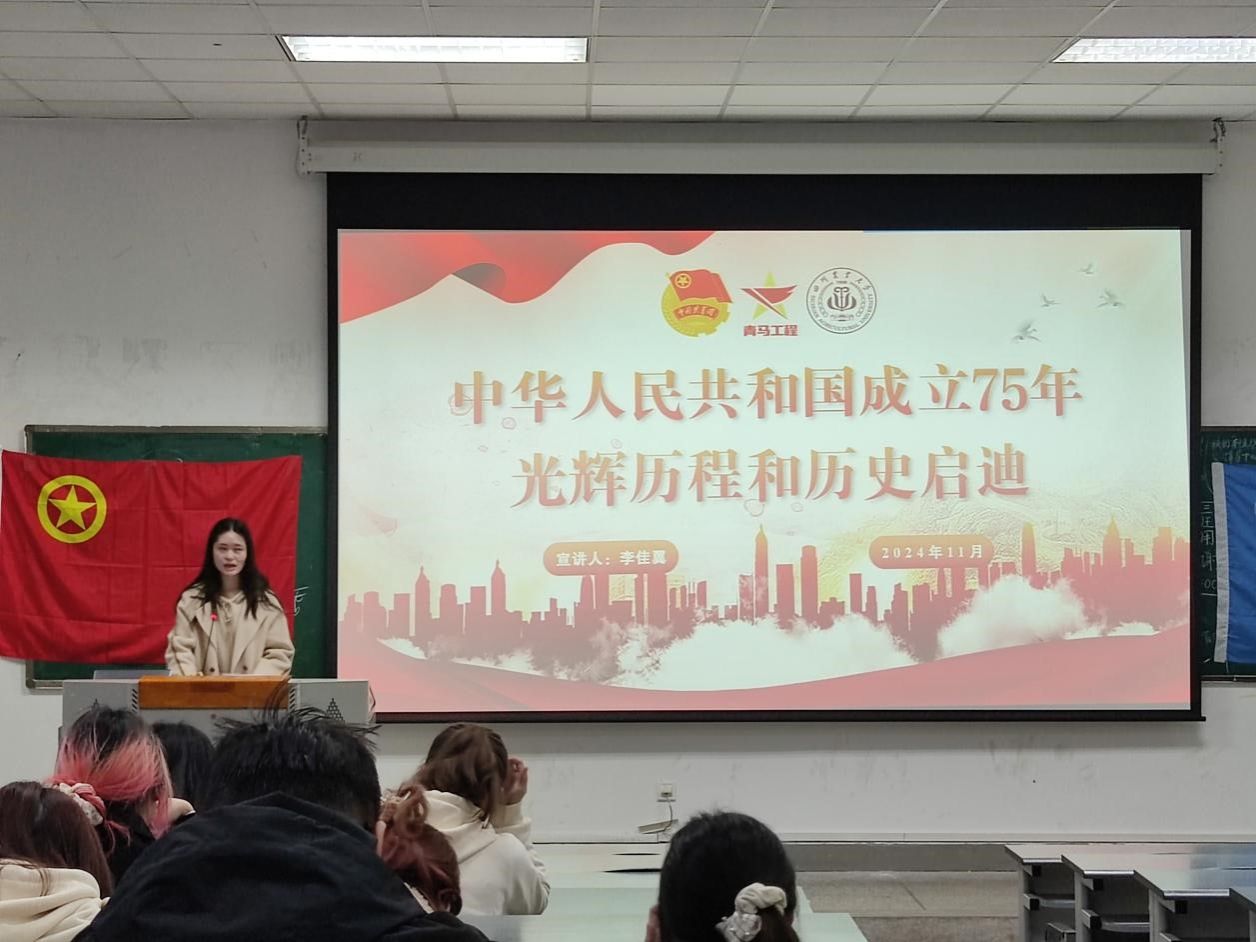 本次活动邀请了青马班学员李佳翼进行了中华人民共和国成立75周年光辉历程和历史启迪主题宣讲。通过宣讲,李佳翼带领在场成员回顾了中华人民共和国成立75周年的光辉进程,学习了光辉进程带来的历史启迪以及当代青年的时代使命。而在随后的“担负新文化使命,铸就文化新辉煌”环节中,主持人通过互动问答的形式带领成员们在轻松愉快的氛围中进一步巩固了相关知识。