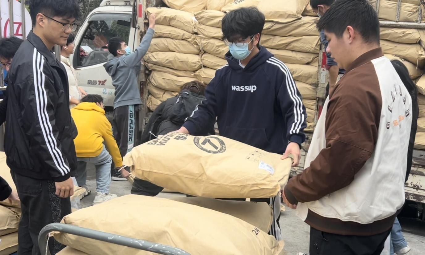 当日下午2点,动医202303班的30名志愿者准时抵达保护中心。中心负责人彭女士负责为志愿者们分配任务——搬运基地采购的粮食。面对近10吨的搬运量,同学们自发分成三个小组。一组负责将粮食从车上搬至推车,一组负责用推车把粮食转运到仓库,还有一组则在仓库内进行整理。现场分工明确、秩序井然,经过不到两小时的努力,所有粮食顺利完成转移。