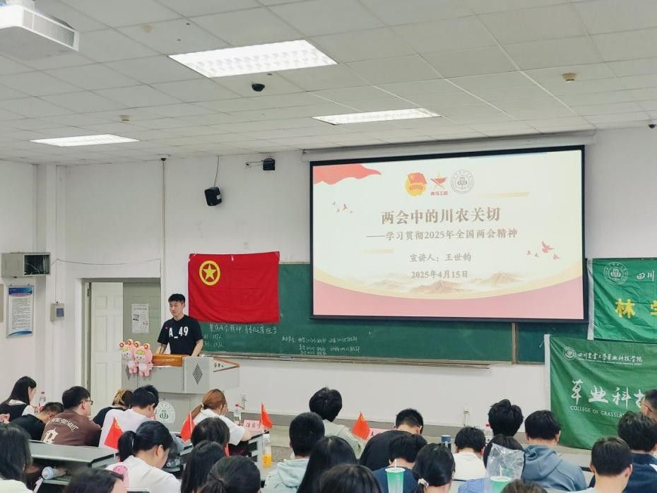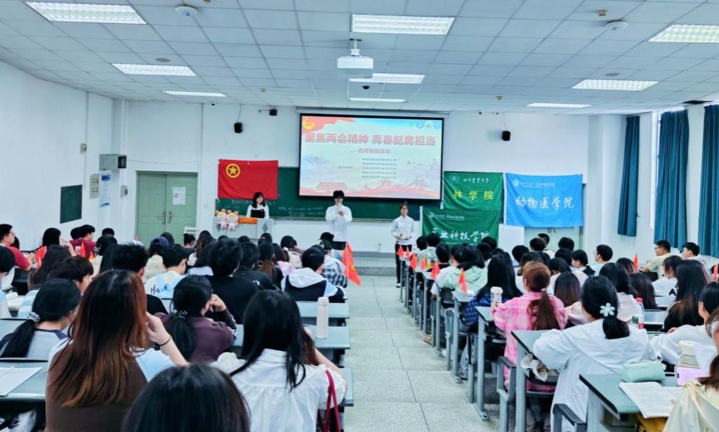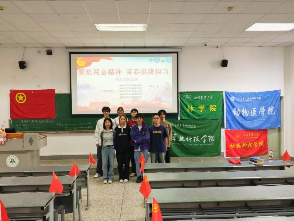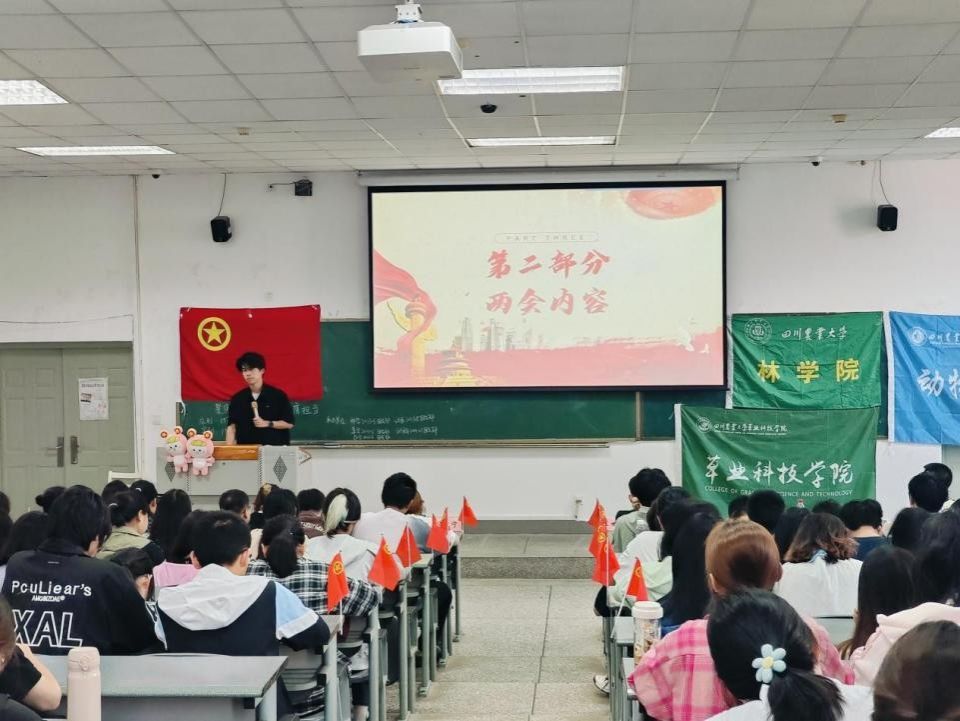 为深入学习贯彻习近平总书记全国两会系列重要讲话精神与重要指示,坚持用习近平新时代中国特色社会主义思想铸魂育人,激发青年团员奋进力量与创新激情,4月15日,动医202305、药学202303、林学202303、草学202303、动科202401五个团支部于4A-209联合举办了主题为“聚焦两会精神,青春挺膺担当”的班团活动。
