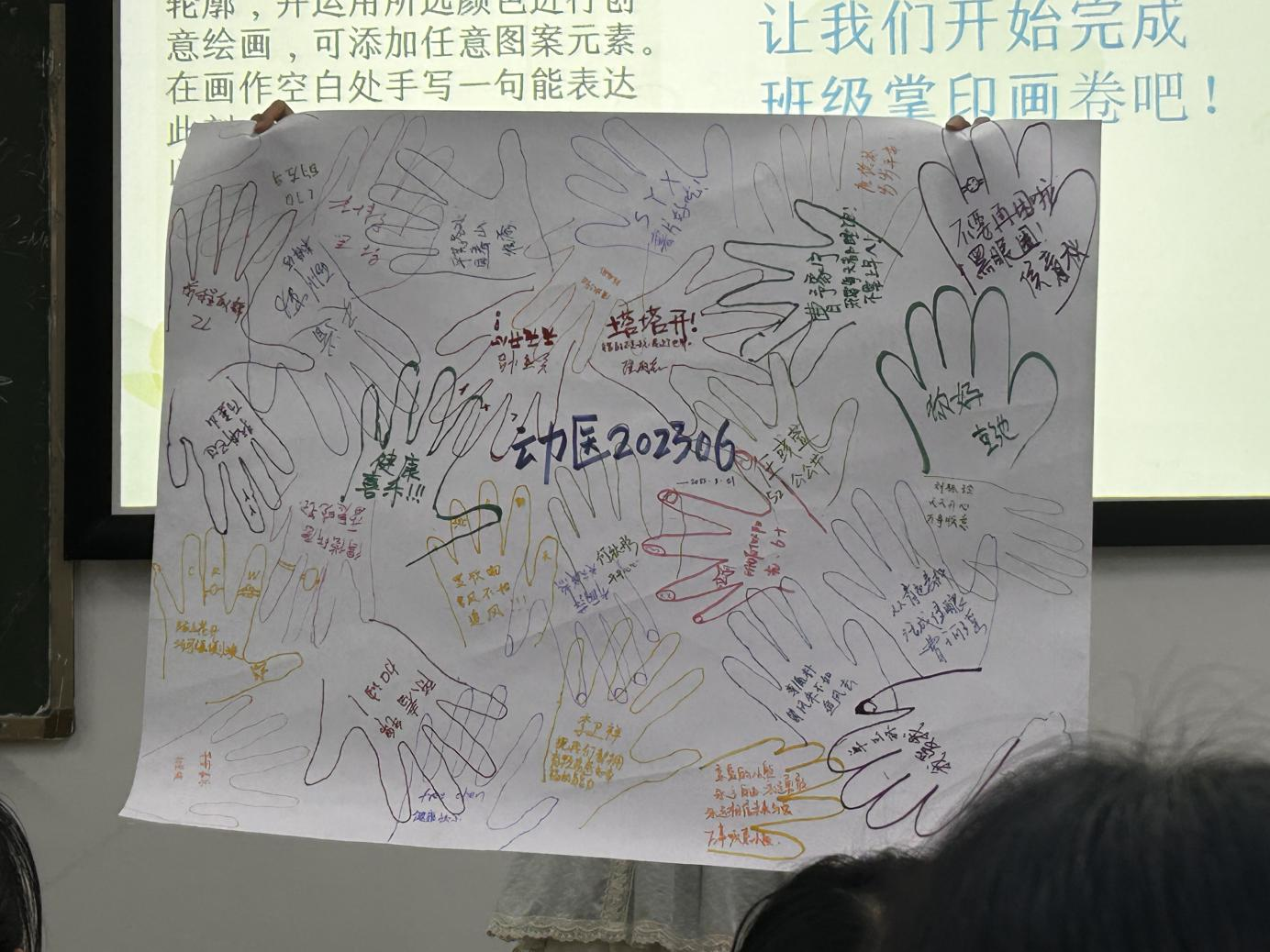 最后的“掌间绘色·笔诉心言”环节将活动推向高潮。学子们挑选颜色来拓印手印并创意绘画,以此描绘心境或表达期许。五彩斑斓的手印画作不仅展现了个人创意,更成为了动医202306班级珍贵的集体回忆。