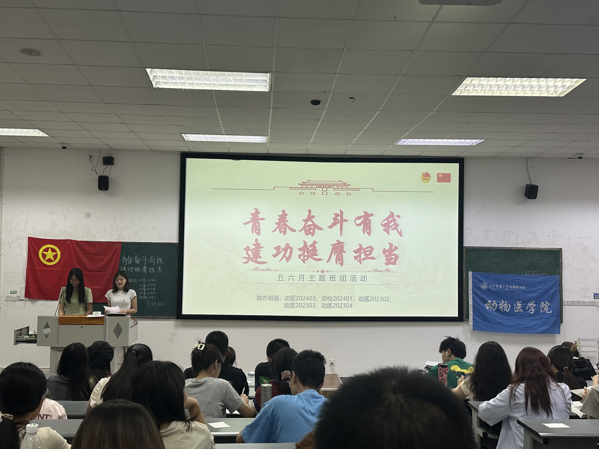 为激励广大青年学子勇担时代使命,以奋斗之姿书写无愧于时代的华彩篇章,动医202403、动检202401、动医202302、动医202303与动医202304于5月23日精心组织并开展了“青春奋斗有我,建功挺膺担当”五月主题班团活动。此次活动犹如一场思想的盛宴、精神的洗礼,为同学们带来了一场别开生面的成长之旅。