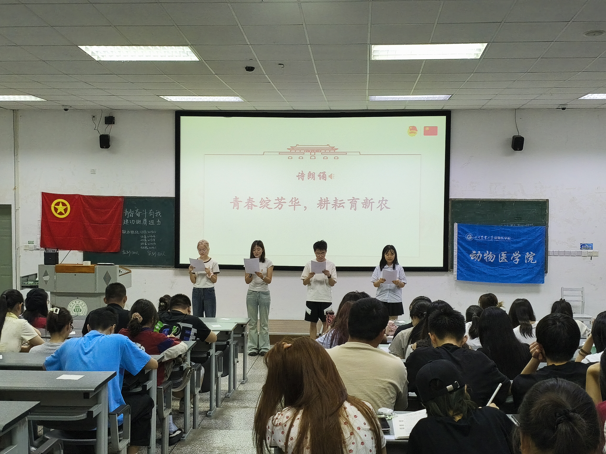 进入“弘耕耘之志,育时代新农”板块,学子们共同探讨了“科技赋能乡村,青春扎根基层”的时代课题。主持人介绍了我校动物遗传育种与繁殖专业2021级博士研究生杨喜堤和2013届校友关祖苹在乡村一线的奋斗故事,生动诠释了“青春扎根基层”的深刻内涵。他们用实际行动证明,乡村不是青春的“退路”,而是梦想的“蓝海”。随后,学子们欣赏了诗朗诵“青春绽芳华,耕耘育新农”,进一步坚定了将个人理想追求融入农业农村现代化和乡村振兴伟大事业的信念。