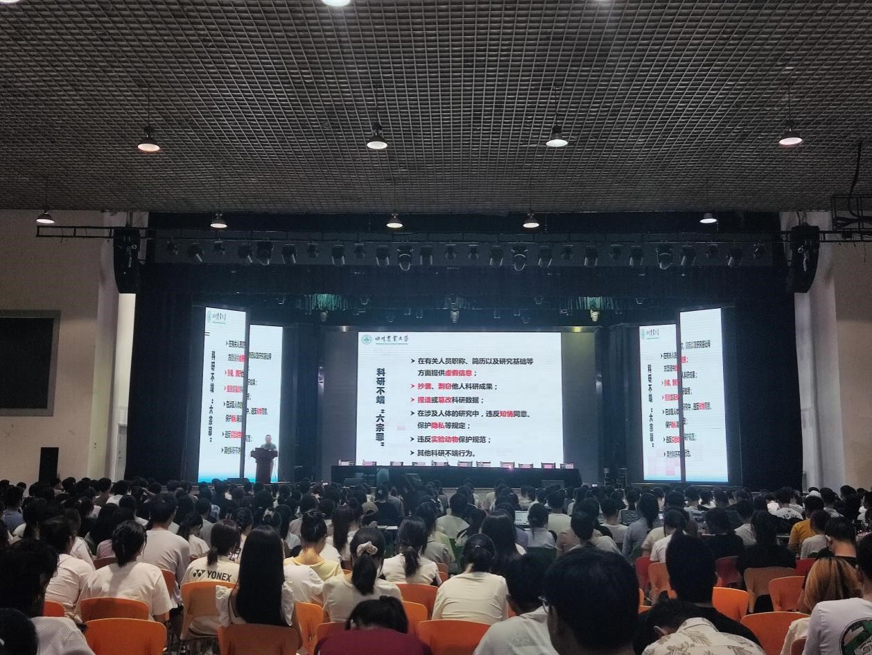 在大会的最后环节,邓俊良教授为在场新生开展了科研诚信与学术道德课程,学院党委办公室主任马保欣则为全体新生进行了2024级新生纪律规矩教育,为新生们的大学生活提供了指导和规范。