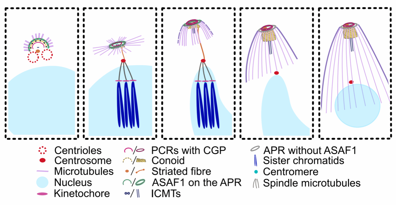 本研究以速殖子为研究对象,利用CRISPR/Cas9基因编辑、超高分辨显微成像、冷冻电子断层扫描(cryo-ET)及邻近标记法(BioID)等前沿技术,发现:1)ASAF1是首次鉴定的子代虫体特有必需蛋白,参与早期APR的组装,其缺失会导致子细胞无法形成;2)CGP蛋白参与类锥复合体组装的中后期过程,是维持PCRs结构稳定的关键因子,其缺失会导致成熟虫体缺失PCRs结构,进而导致位于该结构的关键运动相关蛋白(如FRM1)消失,最终使虫体完全丧失运动能力。