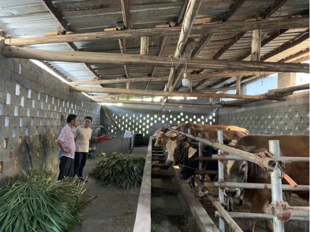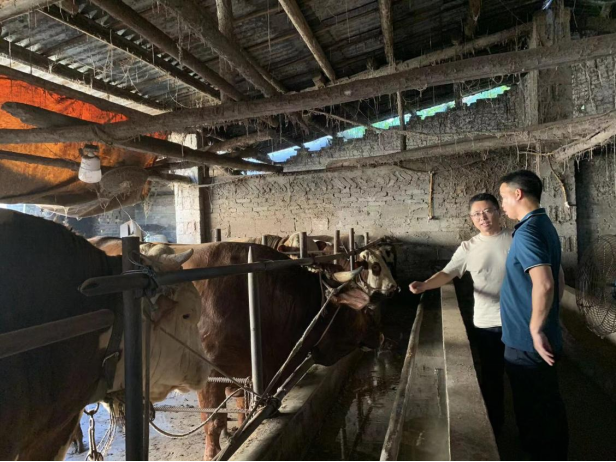 马晓平一行先实地走访了宜宾市兴文县建国村2、6组农户肉牛养殖的生产管理情况,并对养殖场的疫病防控薄弱环节一一提出指导意见,特别是对近期当地气温偏高,肉牛容易发生中暑,马晓平指出:“应尽可能通风、透气、增加风扇、自由饮水等多渠道降温,饮水里面添加电解多维等减少高温应激对肉牛养殖的影响”。