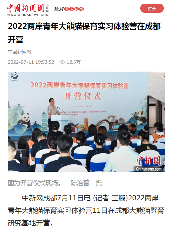 中新网成都7月11日电 (记者 王鹏)2022两岸青年大熊猫保育实习体验营11日在成都大熊猫繁育研究基地开营。