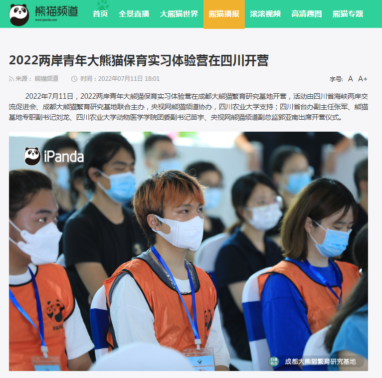 2022年7月11日,2022两岸青年大熊猫保育实习体验营在成都大熊猫繁育研究基地开营,活动由四川省海峡两岸交流促进会、成都大熊猫繁育研究基地联合主办,央视网熊猫频道协办,德赢VWIN官方网站支持;四川省台办副主任张军、熊猫基地专职副书记刘龙、德赢VWIN官方网站动物医学学院团委副书记苗宇、央视网熊猫频道副总监郭亚南出席开营仪式。