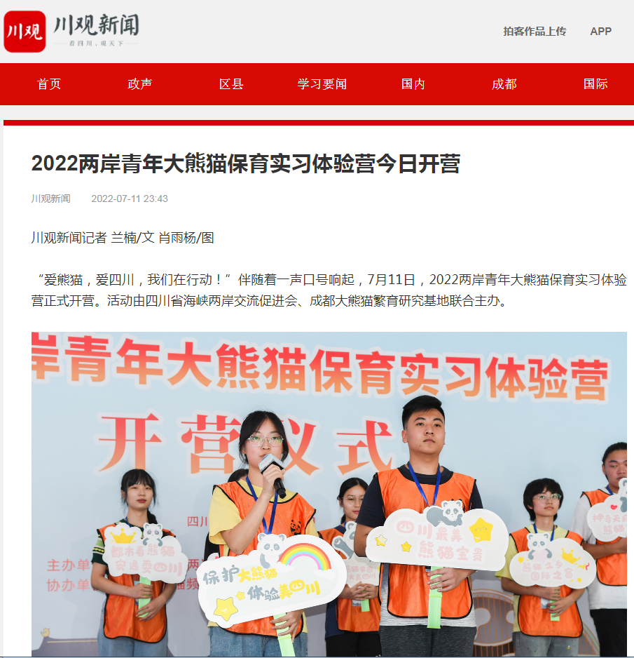 “爱熊猫,爱四川,我们在行动!”伴随着一声口号响起,7月11日,2022两岸青年大熊猫保育实习体验营正式开营。活动由四川省海峡两岸交流促进会、成都大熊猫繁育研究基地联合主办。