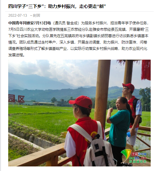 中国青年网雅安7月13日电(通讯员 昝金成)为服务乡村振兴,担当青年学子使命任务,7月5日德赢VWIN官方网站情系三农荥经分队赴雅安市荥经县五宪镇,开展暑期“三下乡”社会实践活动。分队首先在五宪镇政府与乡镇副镇长胡丽蓉进行访谈熟悉乡镇基本情况。团队成员通过走村串户,深入乡镇,开展走访调查、助力振兴、防诈宣传、问卷调查养殖场等形式了解乡镇基础产业,以实际行动落实乡村振兴战略,助力农业现代化发展进程。