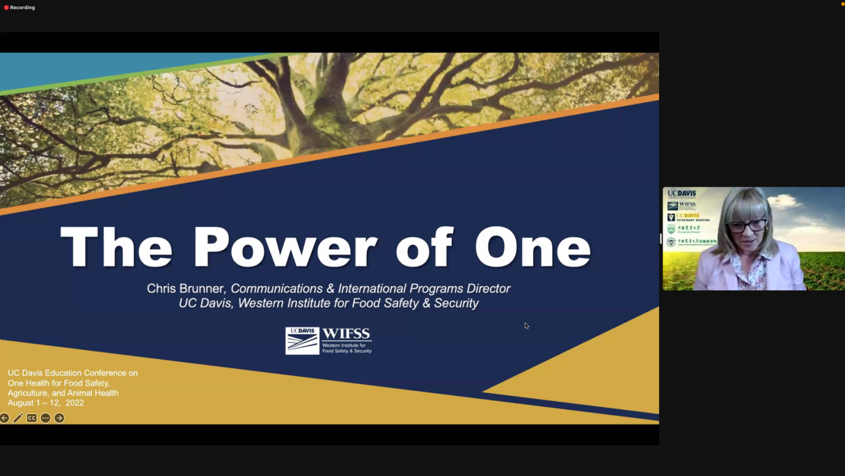 会议启动伊始,西部食品安全与保障中心国际项目部主任克里斯·布朗勒(Chris Brunner)女士以“The Power of One”为主题,运用“一等于一万”的哲学理念以及多个日常事物和案例,引入“One Health”的理念,阐释了“One Health”的意义,以及“人-动物-环境”三者之间息息相关的紧密联系,强调同一健康策略在解决全球公共卫生挑战中的重要性,为此次会议奠定了主基调。此后会议围绕“One Health”理念,聚焦食源性疾病、抗菌素耐药性和寄生虫三大主题进行分享与探讨,并延伸至植物传染病、鱼类寄生虫传染病、农场传染病追溯调查方法应用,以及专业论文写作、艺术设计等不同专业领域。