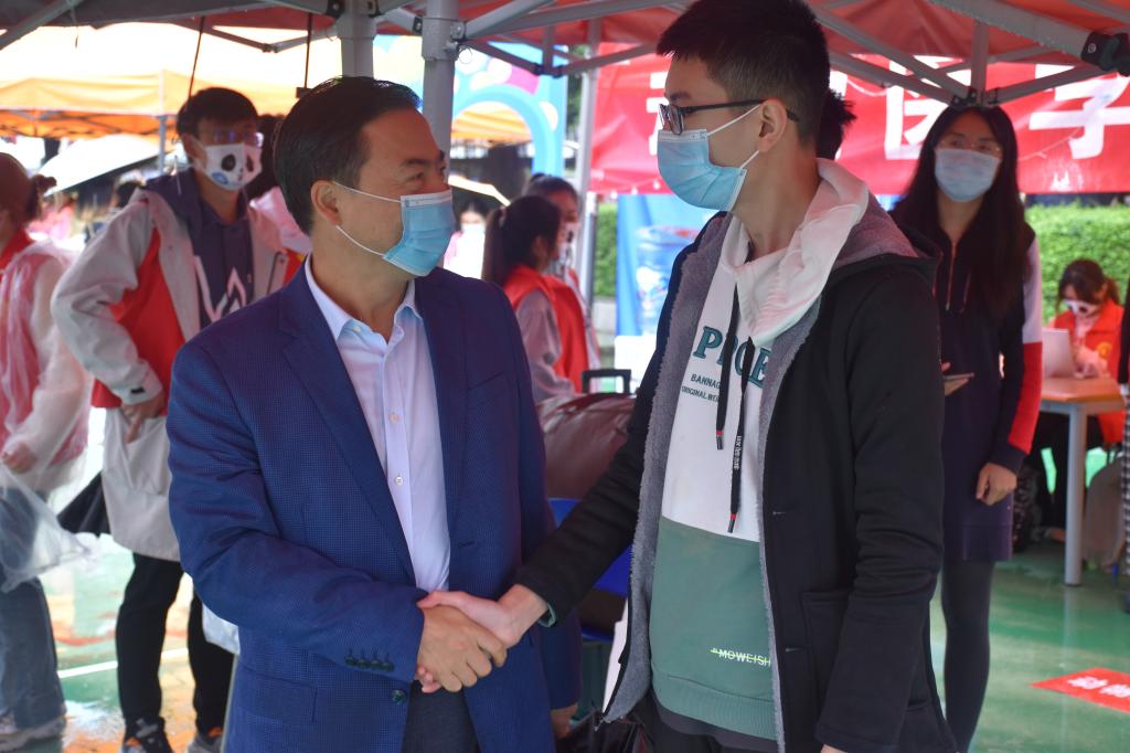 10月8日上午,学院院长程安春、学院党委书记廖鹏等四位院领导及相关负责老师到接待点了解新生报到情况,与新生亲切交流,对报道点执勤志愿者工作给予关心。